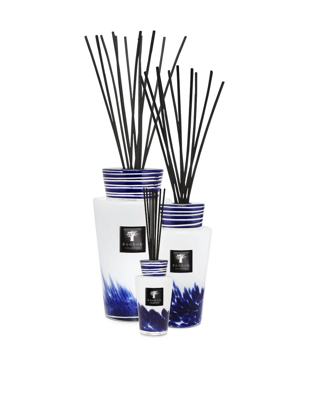 Le verre blanc opaque soufflé-bouche avec des détails de confettis bleus incrustés pour dégager un effet de plumes sur le verre.