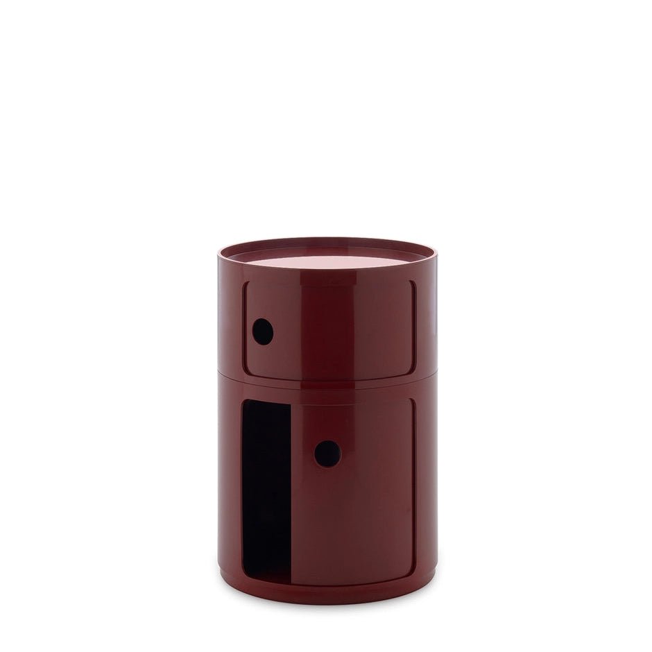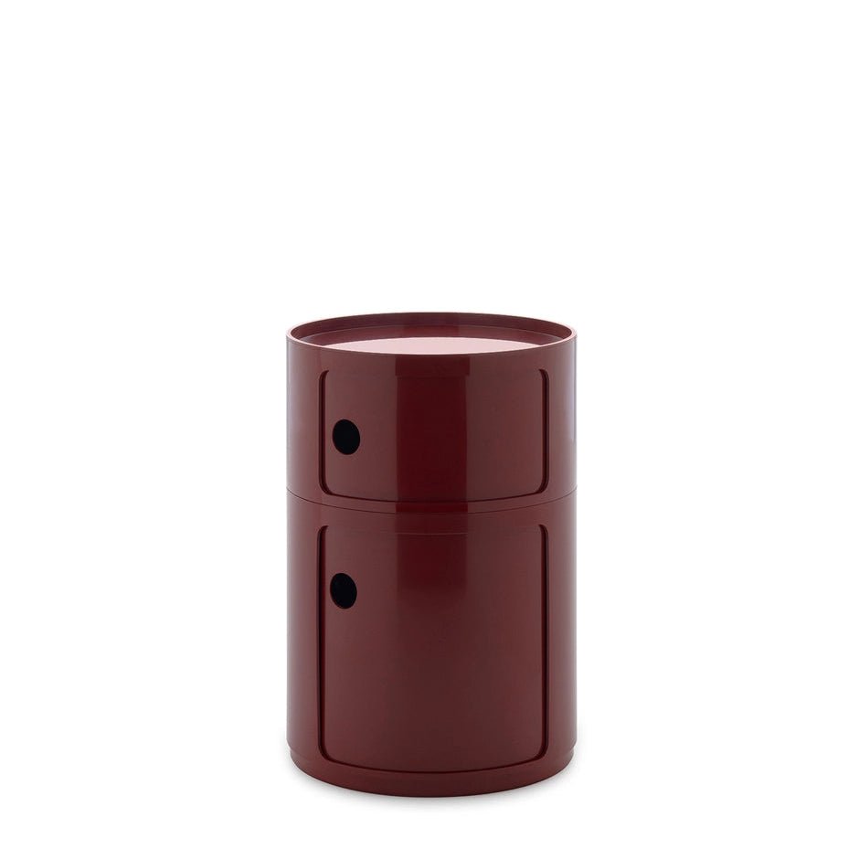 La version ronde du Componibili de 42 cm de diamètre se présente désormais sous une forme renouvelée, fruit d'un nouveau moule industriel qui sublime sa qualité et son esthétique. • La palette de couleurs s'enrichit de teintes déjà disponibles pour la version 32 cm, ainsi que de nouvelles nuances alliant esprit contemporain et références historiques. • La nouvelle version est proposée en configurations 2 et 3 éléments, avec des compartiments non séparables — une évolution technique qui enrichit encore davantage ce classique du catalogue.