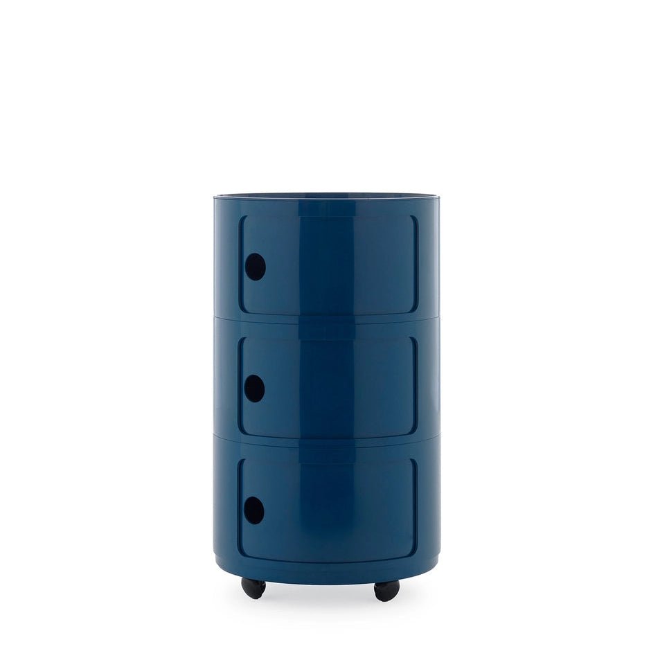La version ronde du Componibili de 42 cm de diamètre se présente désormais sous une forme renouvelée, fruit d'un nouveau moule industriel qui sublime sa qualité et son esthétique. • La palette de couleurs s'enrichit de teintes déjà disponibles pour la version 32 cm, ainsi que de nouvelles nuances alliant esprit contemporain et références historiques. • La nouvelle version est proposée en configurations 2 et 3 éléments, avec des compartiments non séparables — une évolution technique qui enrichit encore davantage ce classique du catalogue.
