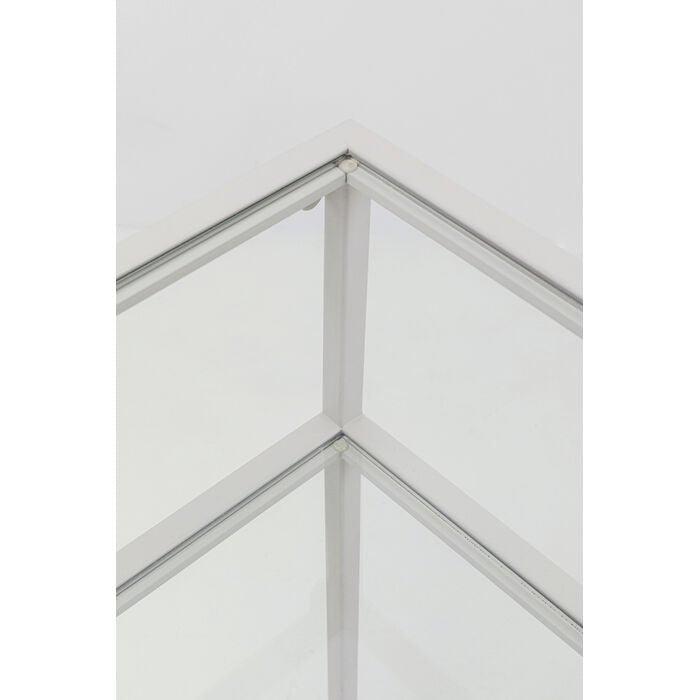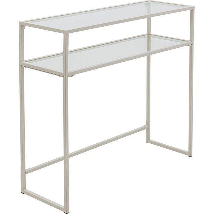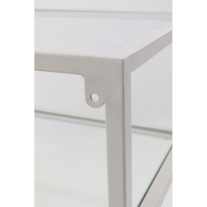Cette console se distingue par ses lignes minimalistes et ses étagères en verre teinté réparties sur deux niveaux. Elle s'intègre parfaitement dans un intérieur raffiné et élégant.
