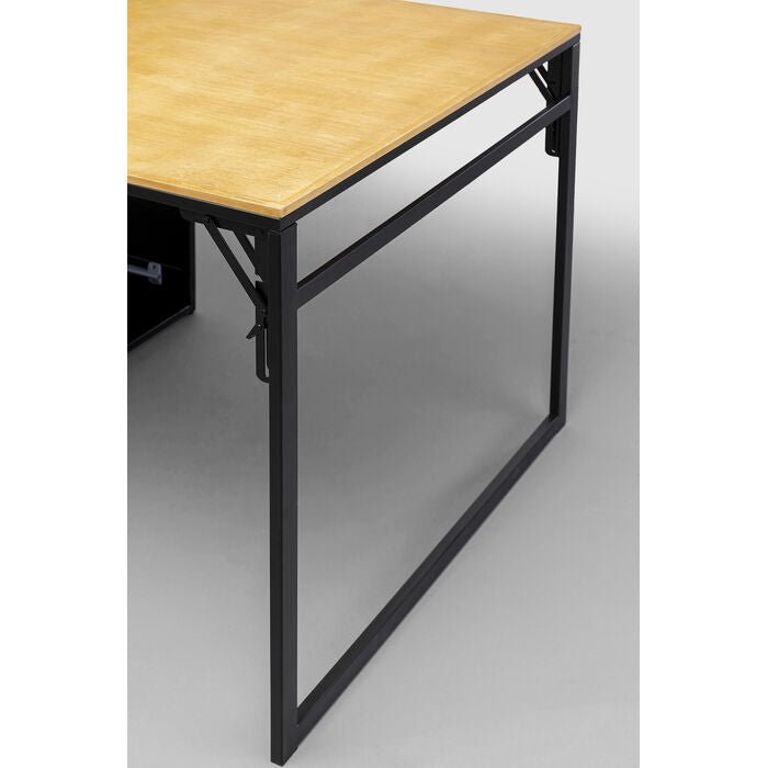 Ce bureau vous séduira grâce à sa conception ingénieuse ! Doté de rangements intégrés pour une organisation optimale, il offre également un plateau rabattable qui permet un gain de place. Idéal pour les petits espaces. Ce bureau peu encombrant, doté d une fonction de pliage pratique, est la solution idéale lorsque l espace est limité. Le plateau en bois massif robuste, avec sa finition cirée de haute qualité, promet une longue durée de vie, tandis que la structure en acier noir ajoute un contraste moderne et élégant. Avec des étagères intégrées pour un espace de rangement supplémentaire, la table est parfaite pour n importe quel coin de votre bureau à domicile. Lorsque vous avez fini de travailler, il vous suffit de replier le plan de travail pour libérer instantanément de l espace dans la pièce. Et tout cela avec une touche de design !