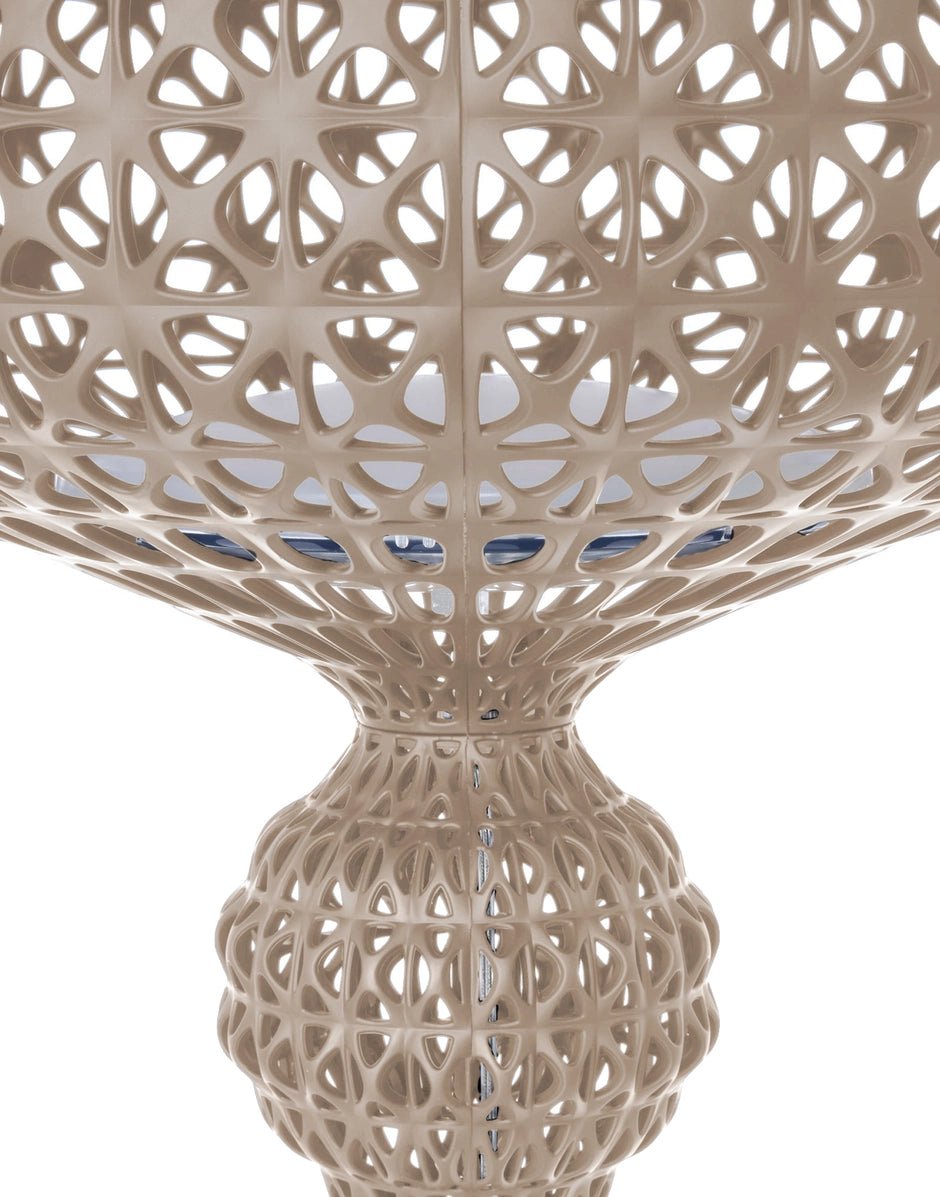 Fabriqué en technopolymère thermoplastique injecté, le lampadaire Kabuki se distingue par une technique de fabrication innovante qui permet de reproduire une trame délicate et raffinée. Cette surface ajourée unique diffuse la lumière de manière douce et graphique, apportant une présence décorative forte à votre espace.