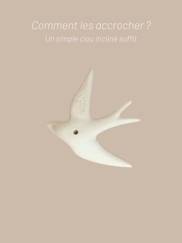 Notre hirondelle Volage peut se placer au mur avec un simple clou incliné, dans un jardin avec un pique, ou se poser sur un meuble.