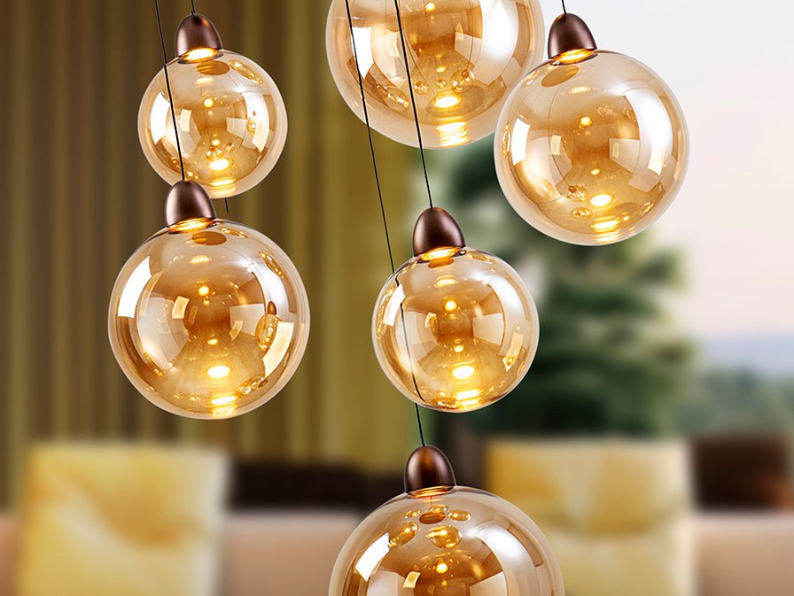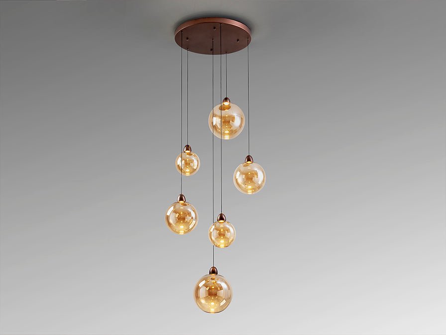 Lampe en métal finition cuivre mat. 6 sphères en verre ambré de 20, 25 et 30 cm de diamètre. Hauteur réglable. LED 36 W, 3000 K.