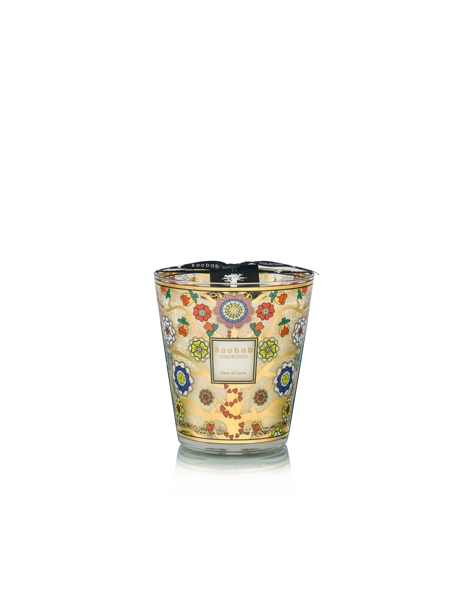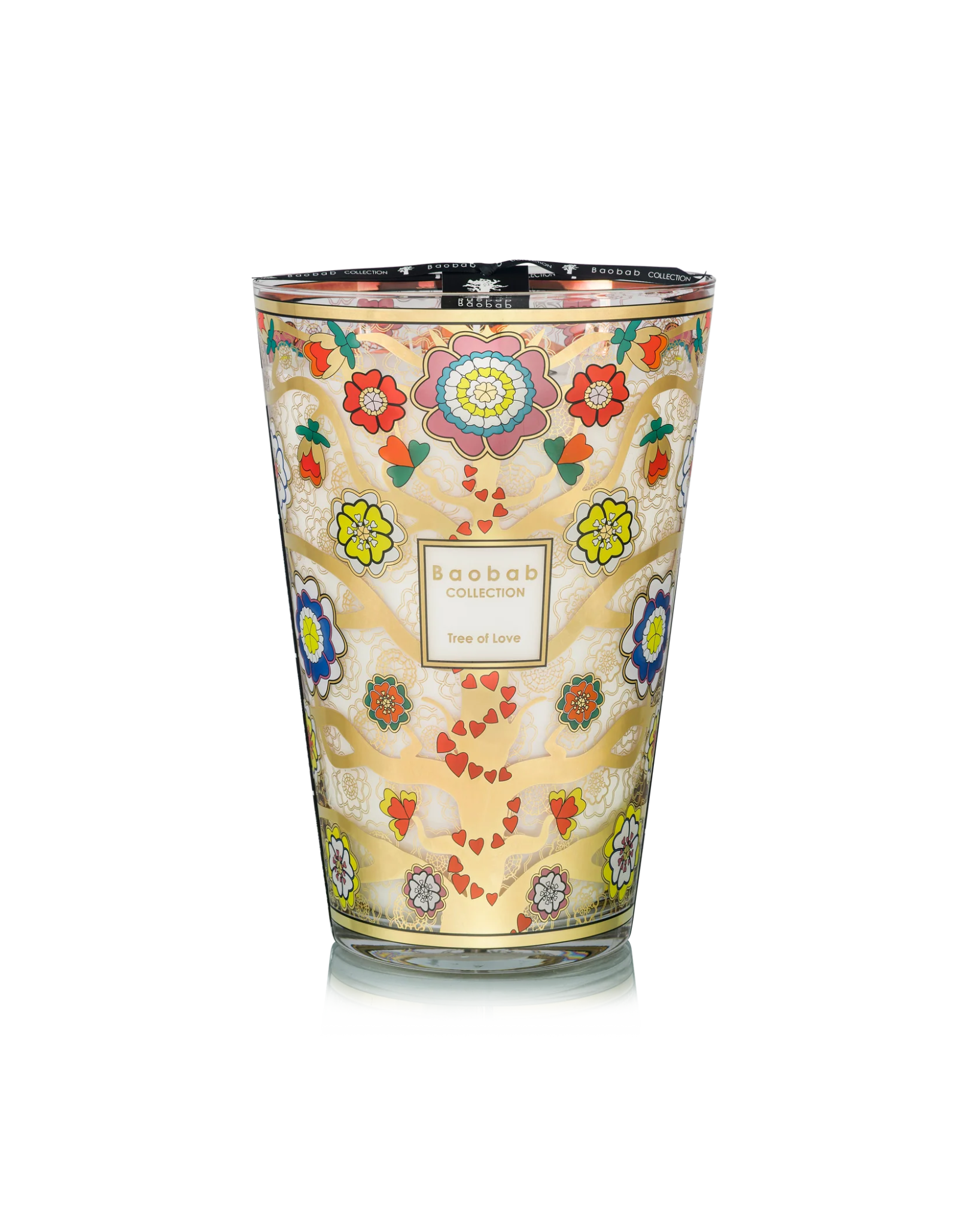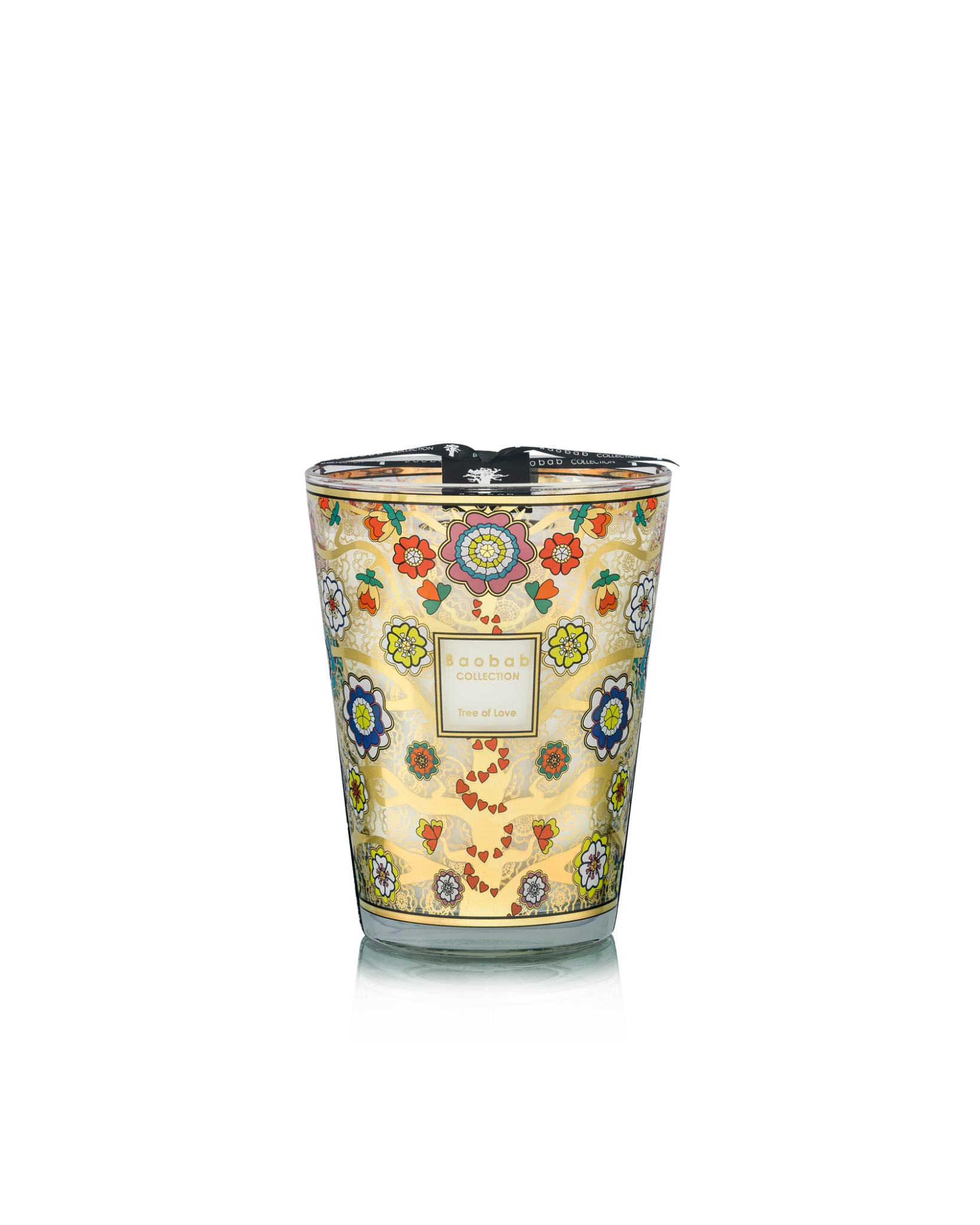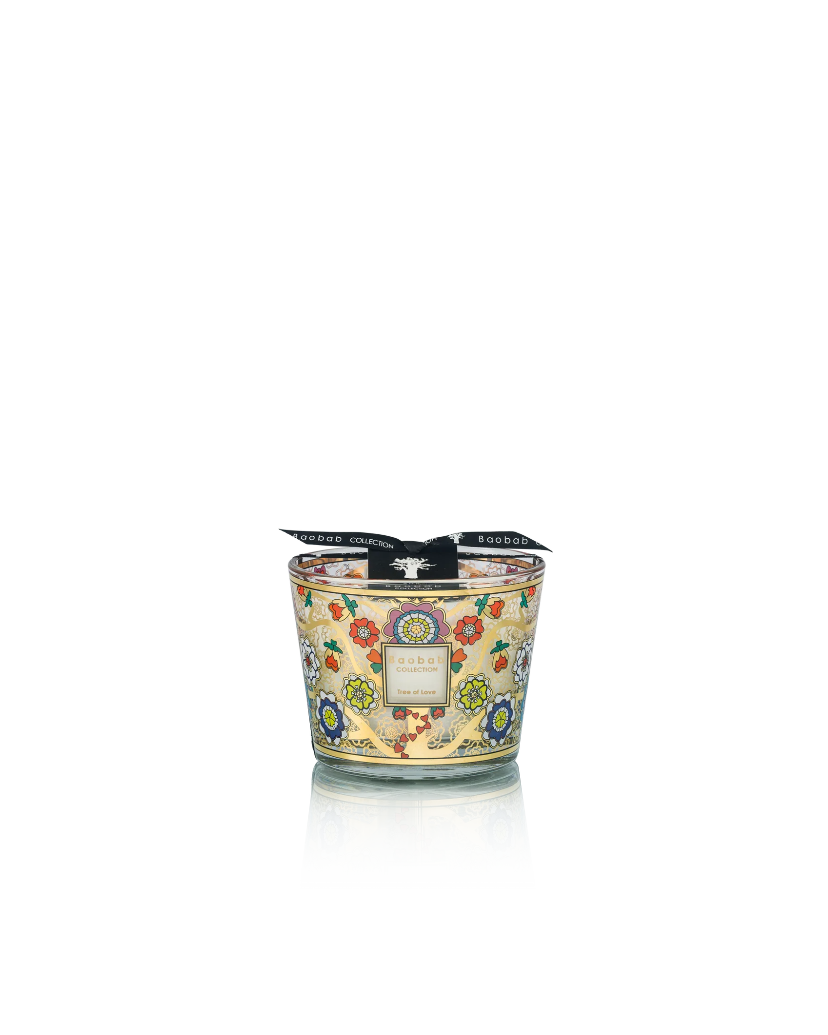 Son verre décoré d’une sérigraphie dorée et multicolore dévoile des branches élégantes ornées de fleurs dont les pétales prennent la forme de cœurs. Ce décor lumineux et raffiné transforme la bougie en véritable objet décoratif.